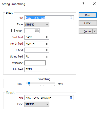 The Smooth form function fits a B-spline curve to the original data in a file containing string information and generates a set of points that define the curve, writing these to an output file. A typical operation results in about six new points for every original point.