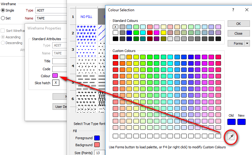 If you want any of the colours to match the wireframe colour, then move the eyedropper tool over the colour patch in the Wireframe Properties dialog (you may need to move the Hatch Properties dialog first to make the colour patch visible). Use a similar technique when editing the hatch in the Property Pane.