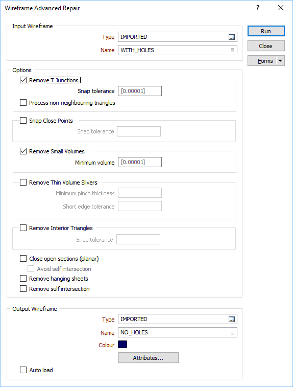Select this option when you are dealing with closed triangulations. In the case of surface triangulations, the self intersection area may be exchanged for a trifurcation (unless it forms a small closed volume pocket that the Remove Volumes tolerance can remove).