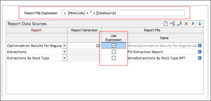 Во вкладке Горные работы, в группе Оптимизация ресурсов, когда вы настраиваете отчет по Карьеру или Оптимизации выемочных единиц во вкладке Рудник > Определение > Вывод > Отчеты, вы можете применять динамические выражения для полей в одном или нескольких файлах отчета.