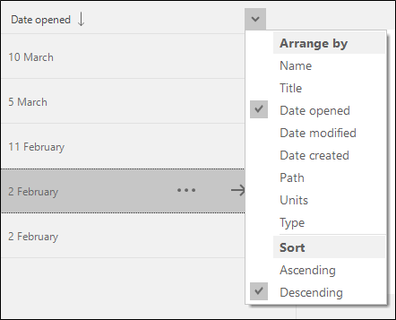 Когда вы нажимаете на вкладку Проект (или выбираете опцию в меню Главная | Проект), чтобы открыть проект через меню, у вас имеется возможность выбрать порядок сортировки и поле проекта для того, чтобы упорядочить данные: