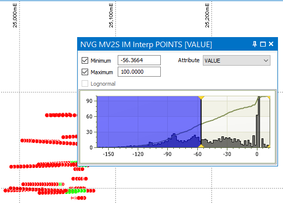 Во вкладку Точки, в диалоговом окне Просмотр | Точки, добавлена опция Интерактивная настройка видимости точек. Эта новая опция упрощает отображение или скрытие точек на основе числовых значений в файле. Если данная опция активна, в гистограмме отражается распределение этих значений, и вы можете настроить видимость точек, передвигая бегунок гистограммы: