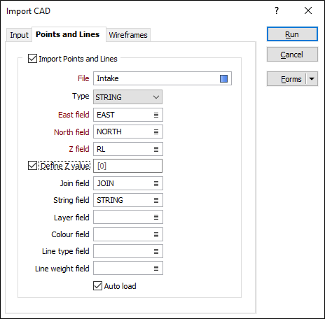 Вкладка Точки и линии диалогового окна Импорт CAD активирована, если файл ввода содержит точечные и линейные объекты. Установите флажок в поле Импортировать точки и линии, чтобы активировать импорт.