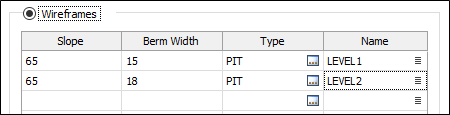 Выберите эту опцию, чтобы применить изменяющиеся условия для областей, заданных одним или более каркасами. Используйте поля ввода, чтобы выбрать Тип и Имя каждого каркаса, и укажите углы откоса и ширину бермы.