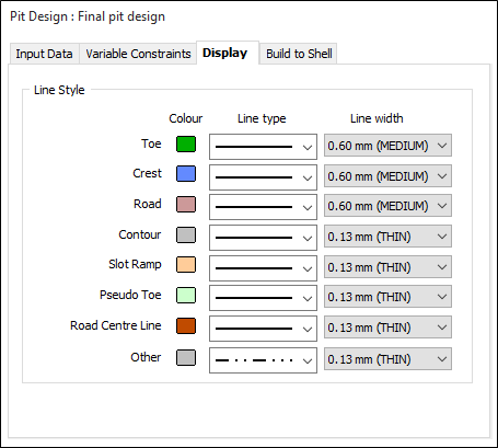 Цвет линии, тип и ширина - параметры во вкладке Проектирование карьера | Просмотр. Они задаются по умолчанию при очистке настроек в диалоговом окне (или когда вы работаете с этой функцией в первый раз). Цвета по умолчанию были протестированы и не теряются на белом и черном фонах.