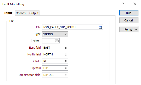 Двойным щелчком мыши (либо с помощью кнопки поиска) выберите Файл ввода. Как правило, файлом ввода является файл стрингов или данных, определяющий разломы, которые необходимо смоделировать. Поддерживаются также другие типы файлов, включая Инклинометрию, Структуру и Отчет.