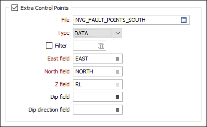 Ориентация созданного каркаса зависит от угла падения и направления падения точек или стрингов во входном файле. Укажите поля в Файле ввода, содержащие угол падения и направление падения для каждой точки.