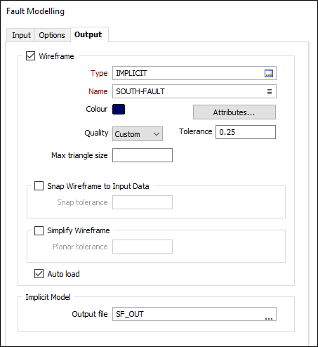 Во вкладке Вывод, в диалоговом окне Моделирование разломов, вы можете записать условную модель в файл вывода и создать выходной каркас.