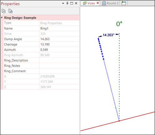 Угол поворота - это угол наклона плоскости веера. Угол, отображаемый в окне Свойства, представляет собой угол плоскости веера, измеренный на длинном разрезе. Смотрите пример (ниже) угла к выработке, указанного для выбранного веера на наклонной выработке.