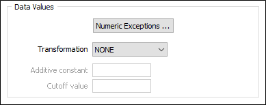 Если режим ввода установлен на Вычислить, используйте группу Значения данных, чтобы применить преобразование данных. Помимо стремления совсем не изменять данные, наиболее часто используемые преобразования - ЛОГНОРМАЛЬНЫЙ и ИНДИКАТОР. Смотрите: Преобразование