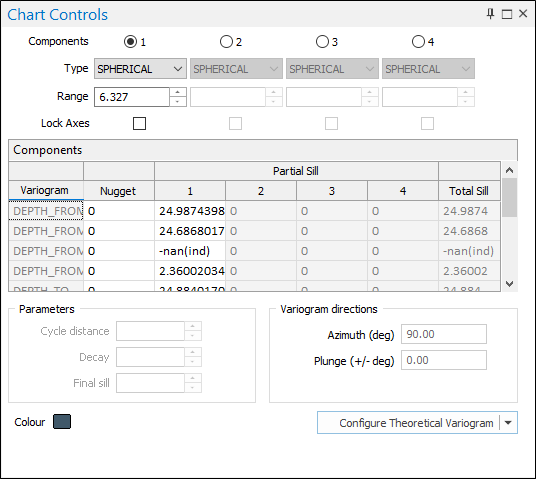 Примечание: если вы моделируете кросс-вариограммы, тип модели и значение диапазона каждого компонента распределяются между вариограммами, которые вы определили в таблице Компоненты (ниже). Интерактивное изменение диапазона компонента на одном графике повлечет его изменения во на всех графиках.