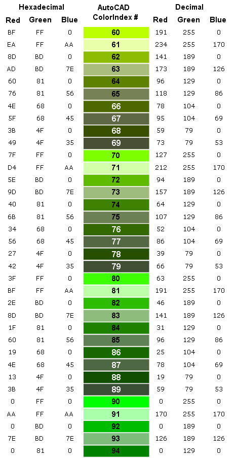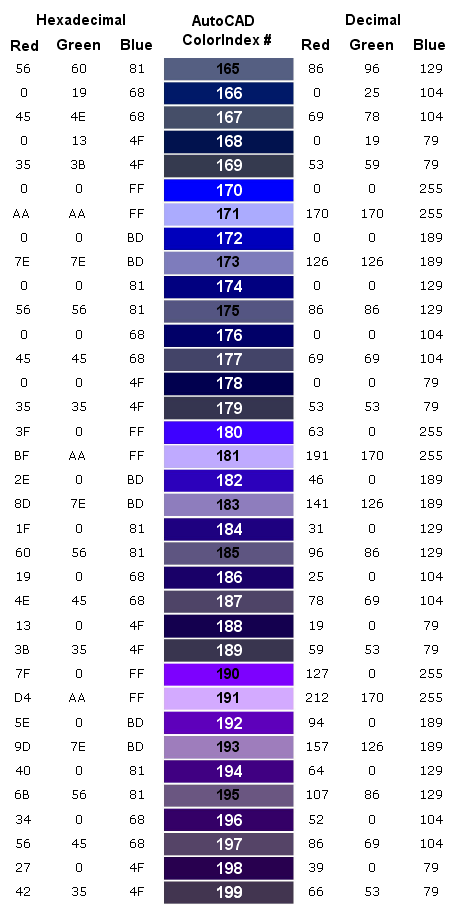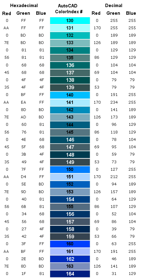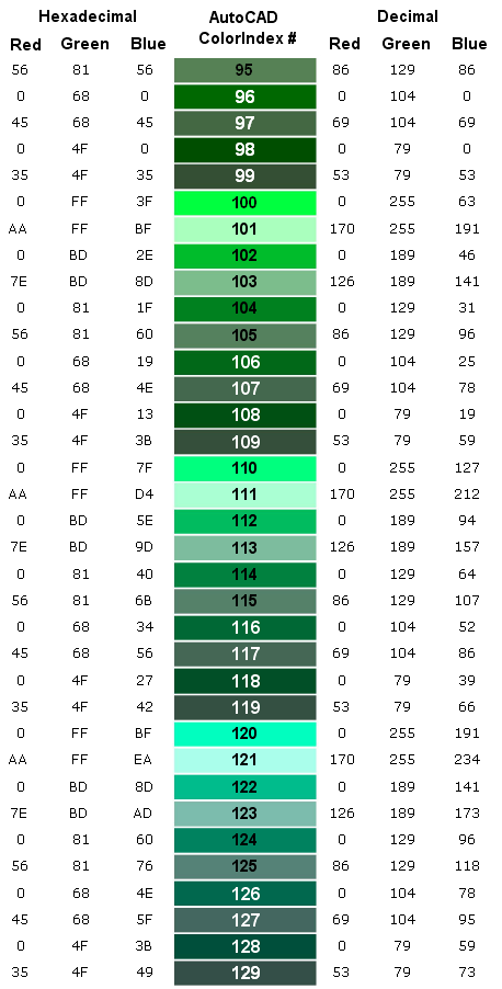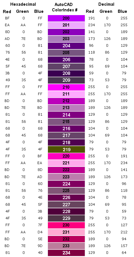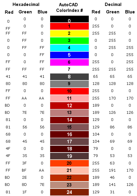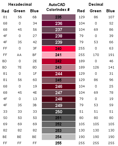 В приведенных ниже таблицах содержатся коды RGB шестнадцатеричной и десятеричной системы для 256 цветов в Цветовом индексе AutoCAD (числа 0-255). Кодировка цветов и сами цвета также показаны в каждом ряду для с соответствующим номером Цветового индекса AutoCAD (ACI).