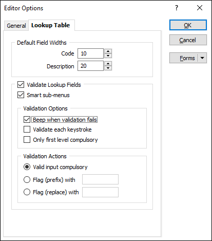 In the Project Options | File Editor form, on the Lookup Table tab, options are provided which determine the appearance and the validation of lookup tables attached to fields.