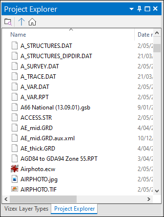On the Window tab, in the Panes group: Click Project Explorer to hide/show the Project Explorer pane. Use the Project Explorer pane to explore the files and folders of the current project.