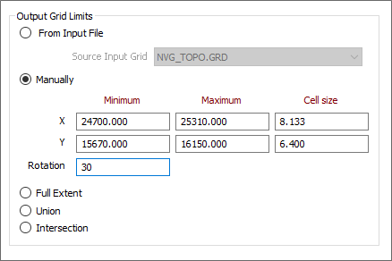 A Rotation value can be specified when choosing to manually set the output grid limits. This provides support for grids with a rotation around Z.