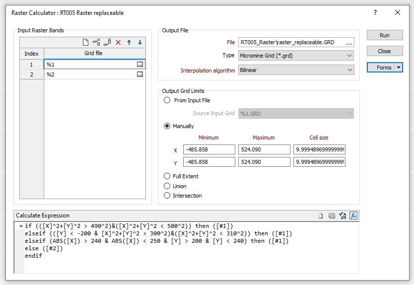 To call the Raster Calculator from a macro, it is often desirable to perform the same operation on different grids. This can now be achieved by using replaceable values to populate the Input Raster Bands grid list: