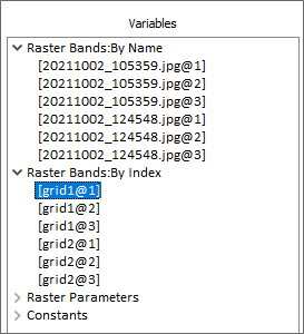 Each raster band is available for selection in the Expression Editor under two different aliases: its name and its row number in the grid list (Index):