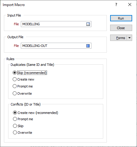 Rules can be applied when a form set referenced by an imported macro already exists in the target project, or when there is a conflict between a form set referenced by the imported macro and a form set in the project.