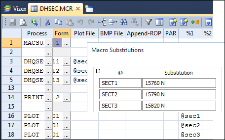 Substitution parameters operate on macro files. To use them you must create a table of codes and corresponding values in Macros | Substitution Table. The substitution table consists of 34 rows. It has a column of codes (@) and corresponding values (Substitution). Once you have filled out this table, save it as a form set for the MACSUB function.