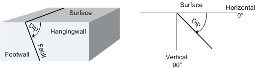 - Dip is measured downwards from the horizontal, as a positive number ranging from 0 to 90°. There are no negative dips in geology;