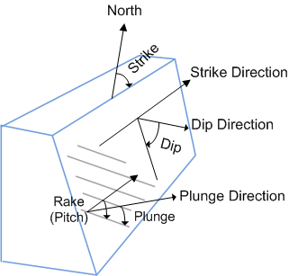 The following diagram illustrates the relationship between strike (or dip direction), dip, and pitch, and also shows the calculated plunge and plunge direction: