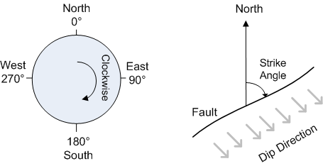 - Strike and dip direction are measured clockwise from north, ranging from 0 to 360°. Dip direction is always at right angles to strike;