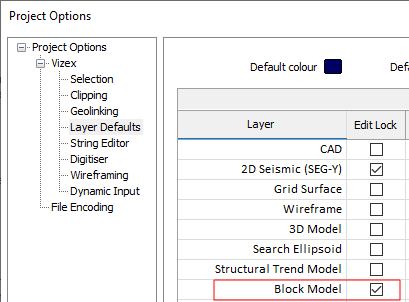 On the Layer Defaults tab of the Project > Vizex Options form, block model layers are now editable by default: