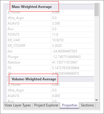 If Density values are available, a Mass weighted average block of properties is also shown in the Vizex Properties tab: