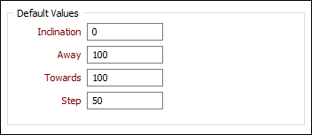 In the Default Values group, specify the default (Inclination, Away, Towards and Step) values used to define the sections written to the output file. These values will be used when the Away, Towards, and Step fields have not been specified - or when the values in those fields are invalid or missing.