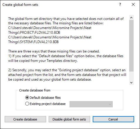 - Select the Default database files option if you want to create a new, empty form sets database.