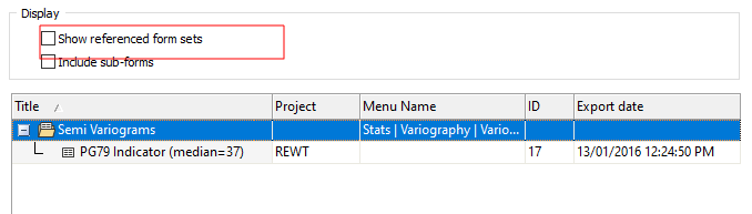 Referenced form sets are form sets that can be referenced by different forms, such as colour sets, hatch sets, symbol sets etc.In the Import Form Sets form, you have the option to show them at the top-level.