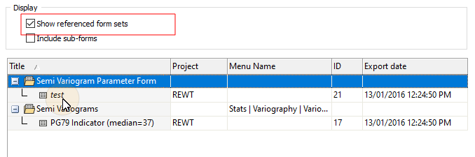 Choosing not to Show referenced form sets option simply removes referenced form sets from the grid at the top-level. Note however that referenced form sets are still visible as sub-forms under the forms that reference them (provided that the Include sub-forms option is selected) and will still be imported with their parents.