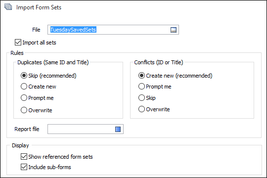 Note: The Import function uses an internal key to uniquely identify each form set. If an exactly matching duplicate of a form set already exists in the FLDVAL database, the import of that form set will be silently skipped (irrespective of the Rule setting).