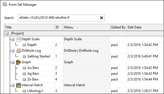 When you enter a valid Search string in the Search box, the grid is updated dynamically. The list of form sets is restricted to those form set folders or form sets that match or partially match the Search string. The text of the Search string will turn red when the search syntax is incorrect. Wildcards are not supported.