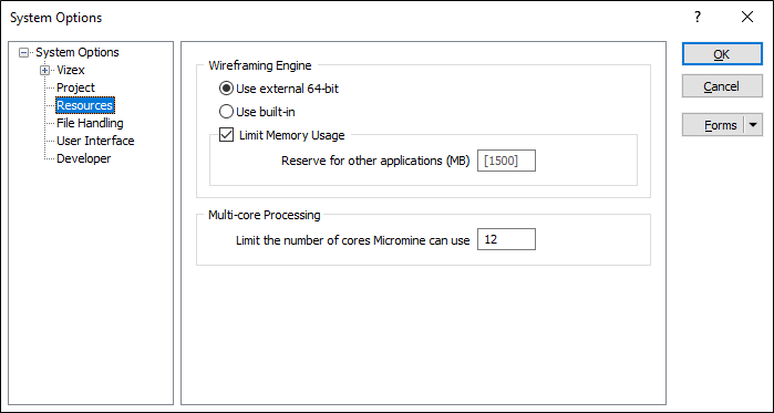 In the Options | System form, on the Resources tab, a number of options can be selected which affect the performance of Vizex when handling very large wireframes. You can also limit the number of cores the application uses when running multi-threaded processes.