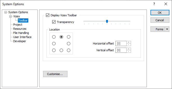Click Customise to customise and save the layout of the toolbar. See: Customise Vizex Toolbar