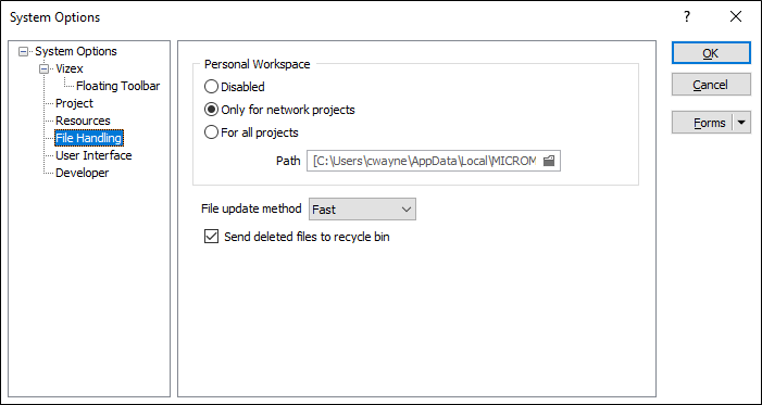 In the Options | System form, on the File Handling tab, the option to disable a personal workspace, or enable a personal workspace for all projects, or for network projects only, is available.