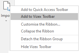 Note that you can add items directly to the toolbar by right-clicking on the tools and menu items on the Vizex ribbon: