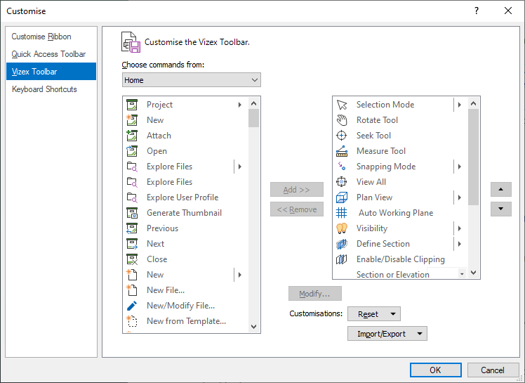 The Import/Export options are used to import customisation files created previously, or export the active customisations for later import.