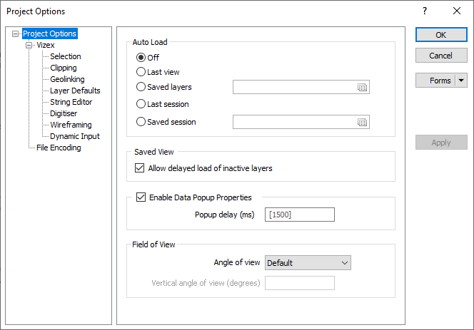 Select the Last View option to load the Default Saved View at the end of each Vizex session. To save your current display and form set settings as a Saved View, click the File | Save menu option. For more information refer to the Vizex Layer Types topic.