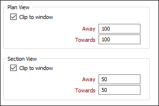 On the Clipping tab of the Vizex Option form, specify the default clipping values to be applied when data is loaded. The values you enter in the Away and Towards fields define the width and position of the data corridor (the “thickness” of the slice).