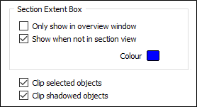 Shadowed and selected objects can be set to ignore clipping. Not clipping selected or shadowed objects can aid in sectional interpretations (as per a virtual light table). Select a display colour for the extent box using the Colour option.