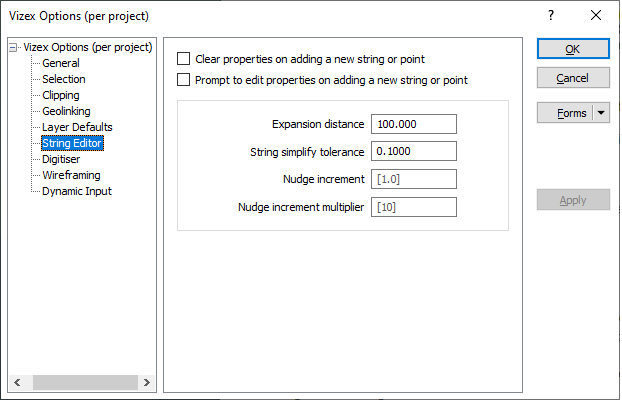 On the String Editor tab of the Vizex Options form, accept or modify the defaults that are applied when you edit strings or points in Vizex.