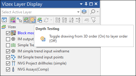 You can use the Depth Testing button on the Vizex Layer Display pane toolbar (or use the right-click menu) to toggle depth testing on or off:
