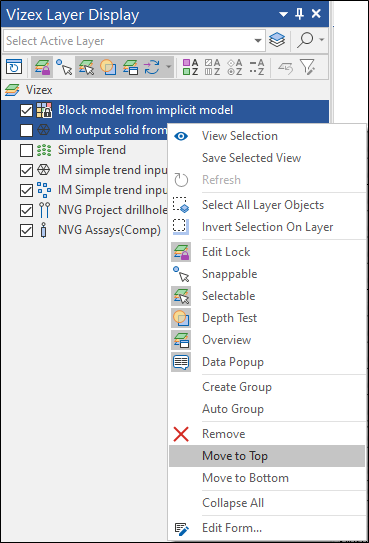 When depth testing is turned off, the listed order in the Vizex Layer Display pane determines which objects are displayed on top of others. The objects at the bottom of the list are drawn first and (depending on the transparency of objects) subsequent layers may obscure what is already displayed. The “draw order” can be changed by dragging objects (in the Vizex Layer Display pane) up or down the list. You can also select Move to Top and Move to Bottom from the right-click menu to move selected layers to the top or bottom of the list. |