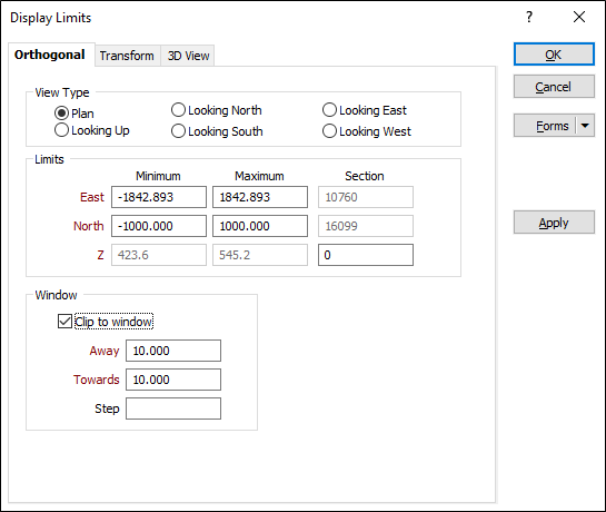 You can view your data in plan and section using one or more windows. Select an option, for example, Looking North or Looking East, to determine the section line. The View Type you select will be applied to the current (active) window.