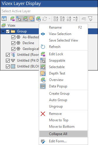 To select the Active Layer, right-click on a layer and select the Active layer menu option. It is important to differentiate between a layer that is 'active' and a layer that is 'current'. The current layer is sometimes referred to as the 'right-click' layer. In other words, it is the layer currently selected in the Vizex Layer Display pane. The 'active' layer and the 'current' layer need not be the same.
