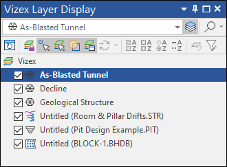 The name of the current layer is highlighted in the Vizex Layer Display pane. The name of the Active Layer is shown in the Vizex Layers toolbar.