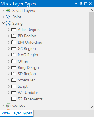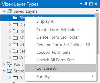 Form Set Types are shown as parent nodes in the Vizex Layer Types pane. These are the data objects (points, strings, outlines, wireframes etc.) you want to load and display as layers in Vizex. If you have a large number of form sets they can be organised into Form Set Folders.