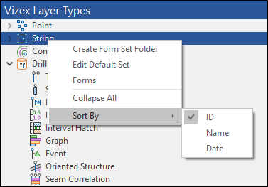 Select an option from the right-click menu to sort the form sets in the Vizex Layer Types pane by ID, sort them alphabetically, or sort by date modified. When you select a sort option, the sort is applied to the whole tree.
